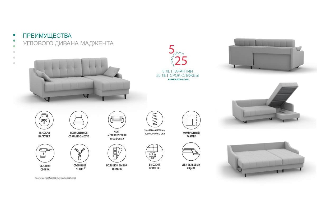 Мягкая мебель, кровати мягкие и малые формы (столики журнальные и придиванные, стеллажи «ЛУКАС»), собираются в день доставки.